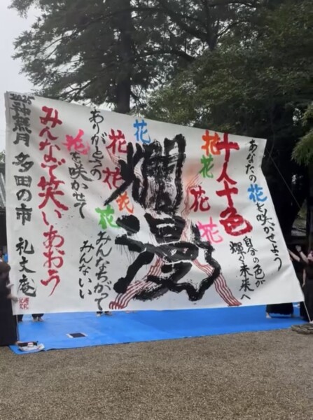 多田の市でのパフォーマンス。中学生書道部と礼文庵パフォーマンスチームのコラボ書道パフォーマンスをさせて頂きました。