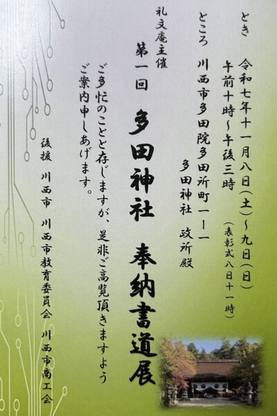 多田神社の政所殿をお借りして、奉納書道展を開催致します!
