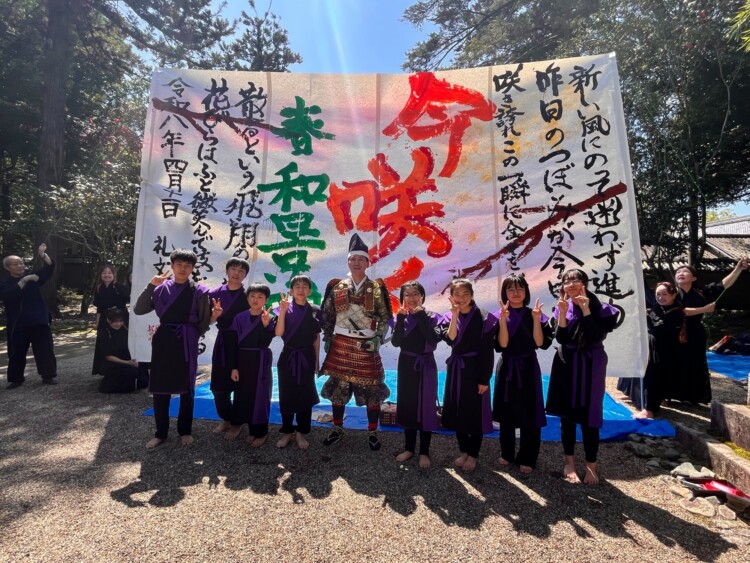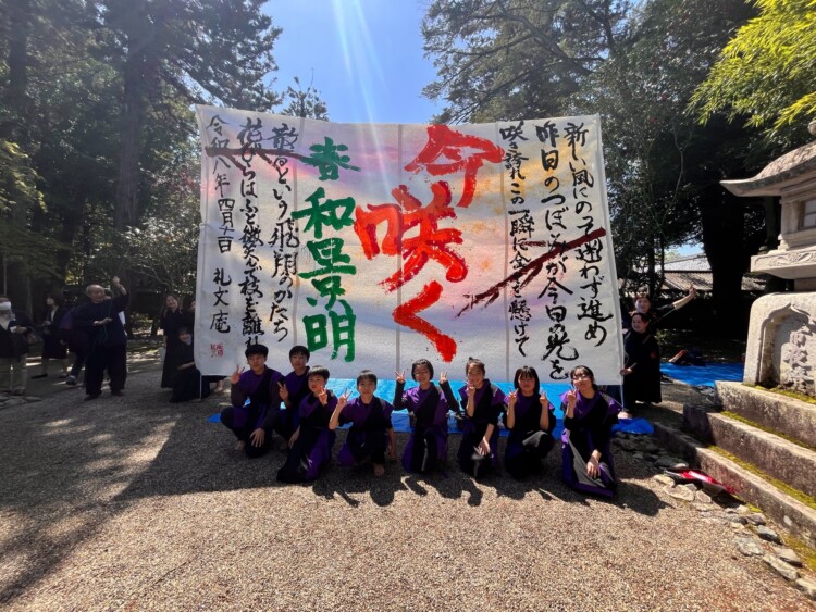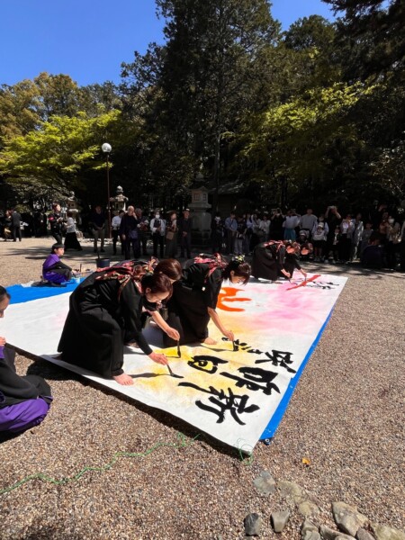 晴天の元、多田神社にて奉納書道パフォーマンスを披露しました。