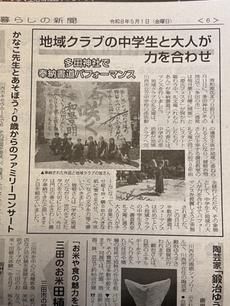 先日の【多田神社奉納書道パフォーマンス】の記事が、暮らしの新聞5月号に掲載されました!